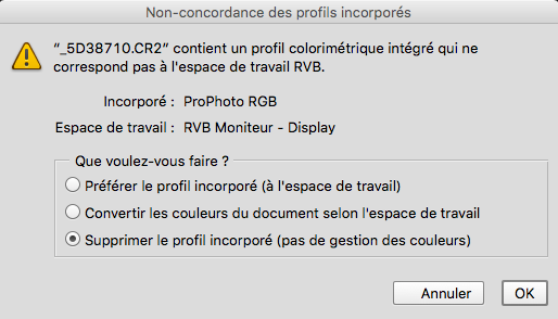 "Nom de votre image" contient un profil colorimétrique intégré qui ne correspond pas à l'espace de travail RVB.